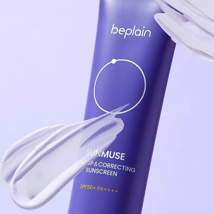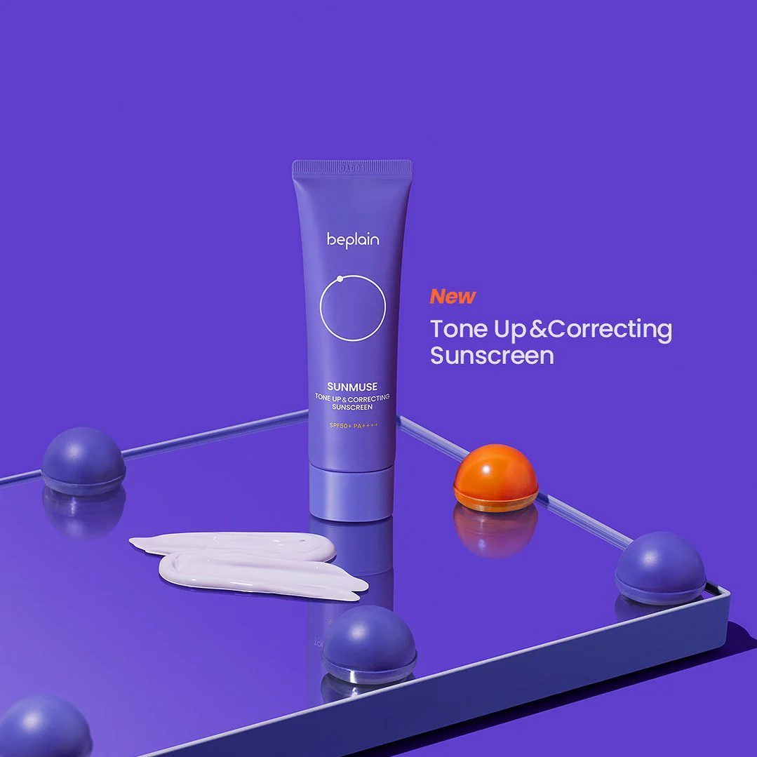 Kem chống nắng Beplain Sunmuse Tone Up & Correcting Sunscreen với màu tím đầu tiên giúp nâng tone cùng finish căng bóng.