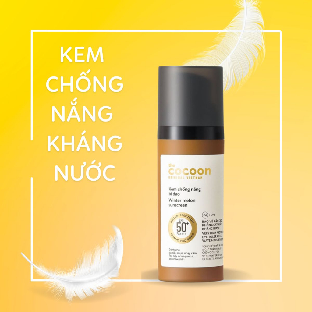 Kem Chống Nắng Cocoon Bí Đao Quang Phổ Rộng 50ml là kem chống nắng thuộc thương hiệu mỹ phẩm thuần chay Cocoon đến từ Việt Nam. Sản phẩm nổi bật với công thức kết hợp các màng lọc thế hệ mới cùng chiết xuất bí đao và các thành phần chống oxy hóa giúp tăng khả năng chống nắng, bảo vệ da hiệu quả trước các tác nhân gây hại cho da như tia UV, khói bụi,…. Đồng thời sản phẩm giúp giảm bóng dầu, không gây bí da hay nhờn rít nên phù hợp với da dầu, nhạy cảm.