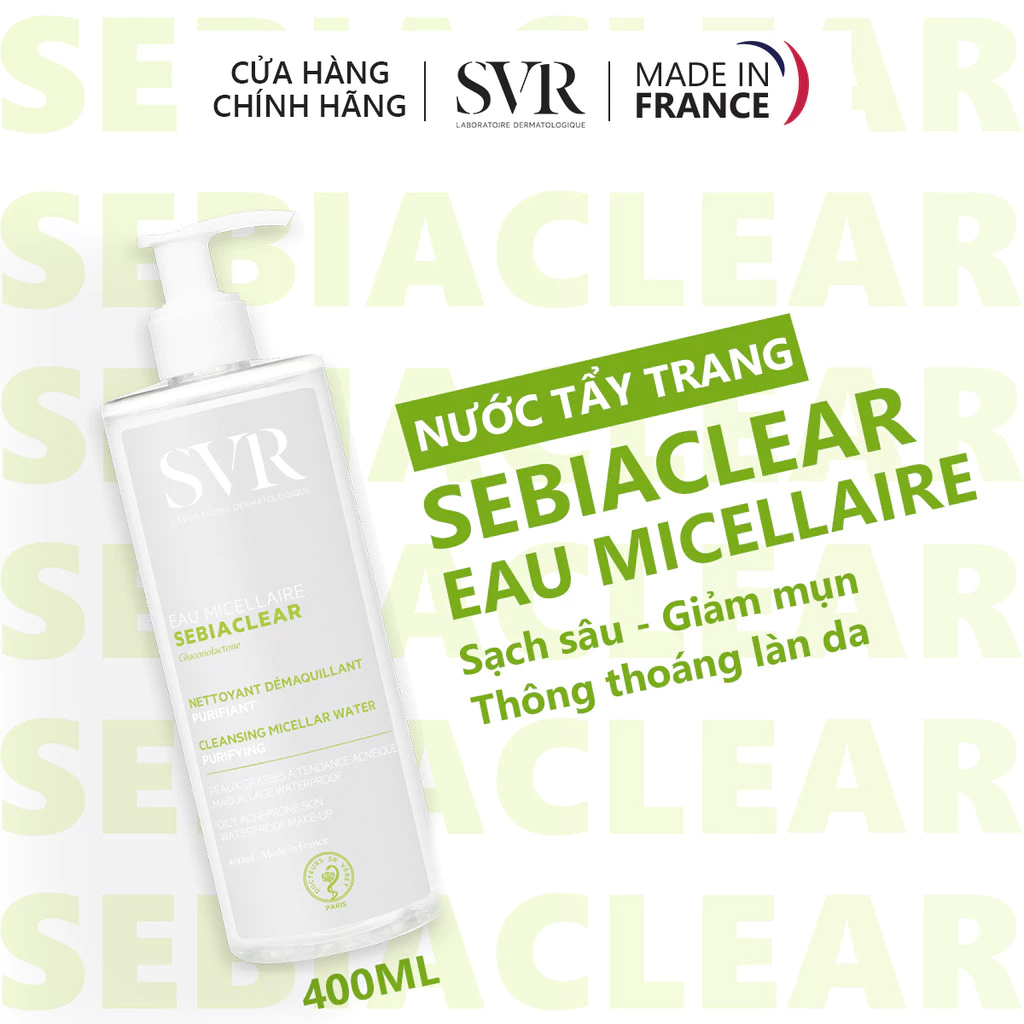 Nước Tẩy Trang SVR Sebiaclear Eau Micellaire là dòng nước tẩy trang dành cho da dầu đến từ thương hiệu mỹ phẩm SVR của Pháp, giúp làm sạch, rửa và tẩy lớp trang điểm chỉ trong 1 bước, thậm chí là lớp trang điểm không thấm nước. Bên cạnh đó, sản phẩm còn giúp loại trừ cặn bẩn và bã nhờn dư thừa mà không làm khô da, giúp làn da sạch và tươi mát.